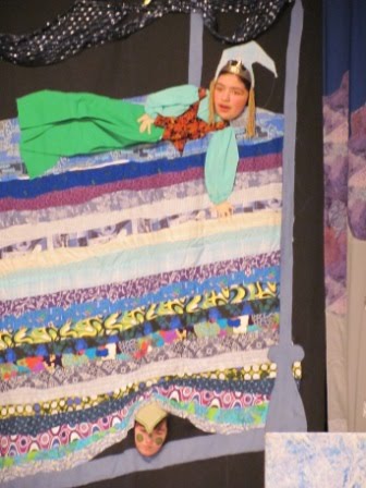 The play was a takeoff on the Princess and the Pea–very loosely based on it and updated for our modern era (the princess doesn’t marry the prince in the end). The “Pea” is actually her friend–her parents always told her to “mind her Ps and Qs,” so she did just that with her Pea. This is how they handled the mattress scene–Princess on top and Pea below.