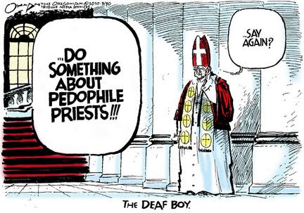 I find it fascinating that the Church is defending itself by saying that they are being singled out for victimization, because the sexual abuse of children is “a horror that has cursed every culture, religion, organization, institution, school, agency and family in the world,” according to New York archbishop Timothy Dolan, who quotes scholar Paul McHugh as saying “Nobody is doing more to address the tragedy of sexual abuse of minors than the Catholic Church.” Right.