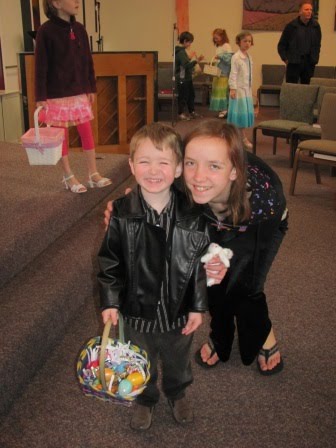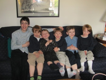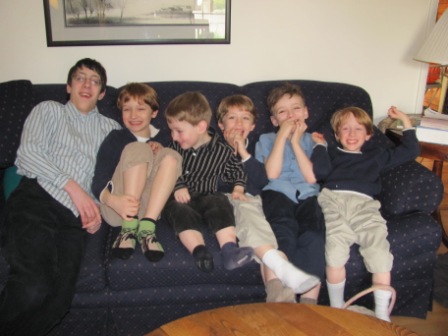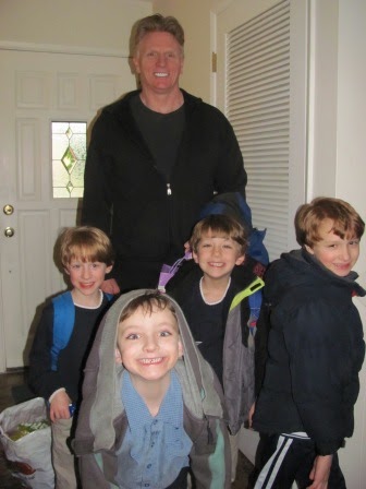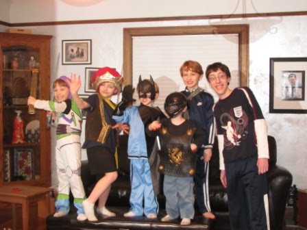 While we were eating our dinner, the kids dove into our costume collection and did a series of parades for us through the living room–Chris was the announcer. Here is one of the many assortments: