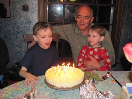 Dad and Kieran blowing out the candles on their lemon cheesecake: