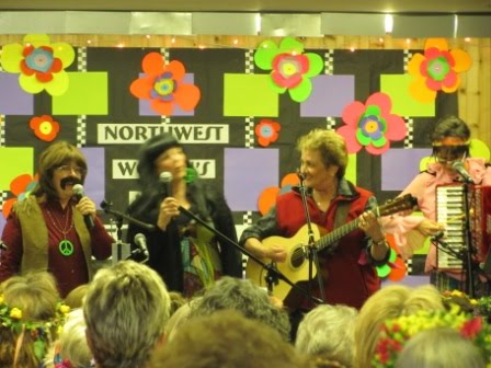 The camp started on Friday afternoon. After registration was the first of many song circles, led by members of Motherlode. (A song circle is a musical gathering where each person takes turns choosing a song.) After the newcomers’ meeting (which Mom and I attended since we felt a bit like newcomers ourselves) and dinner was the opening event and a teachers’ concert. Each teacher talked about the courses she would be offering and performed. The theme for the weekend was the 60s, and I can’t imagine an easier theme–for dress-up, decorations, and especially–MUSIC!
