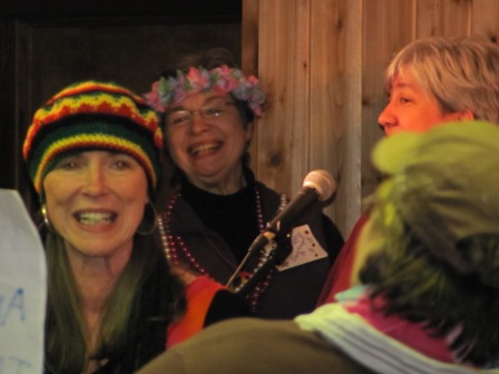 The camp started on Friday afternoon. After registration was the first of many song circles, led by members of Motherlode. (A song circle is a musical gathering where each person takes turns choosing a song.) After the newcomers’ meeting (which Mom and I attended since we felt a bit like newcomers ourselves) and dinner was the opening event and a teachers’ concert. Each teacher talked about the courses she would be offering and performed. The theme for the weekend was the 60s, and I can’t imagine an easier theme–for dress-up, decorations, and especially–MUSIC!