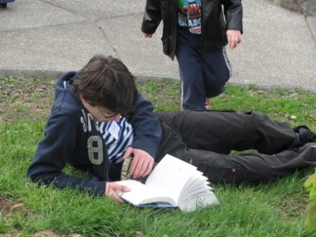 These are the scintillating photos of after-the-blessing–Chris with his nose in a book: