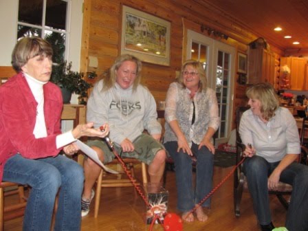 Sam began opening her gifts, and among the many alcohol-related presents (including some gorgeous hand-painted glasses) and jewelry and artwork was a weird game that has the sole object of shocking one or two of the players. I can’t imagine why anyone would want to play it unless there was alcohol involved. At any rate, Sam’s mom Judy and her friends and relatives (including the person who gave Sam the gift) tried out the game. Each person grabs a handle of the game–and then it suddenly shocks someone. When this actually happened, the women jumped up and screamed, sending the rest of us into hysterics. Apparently it was set on “high”!