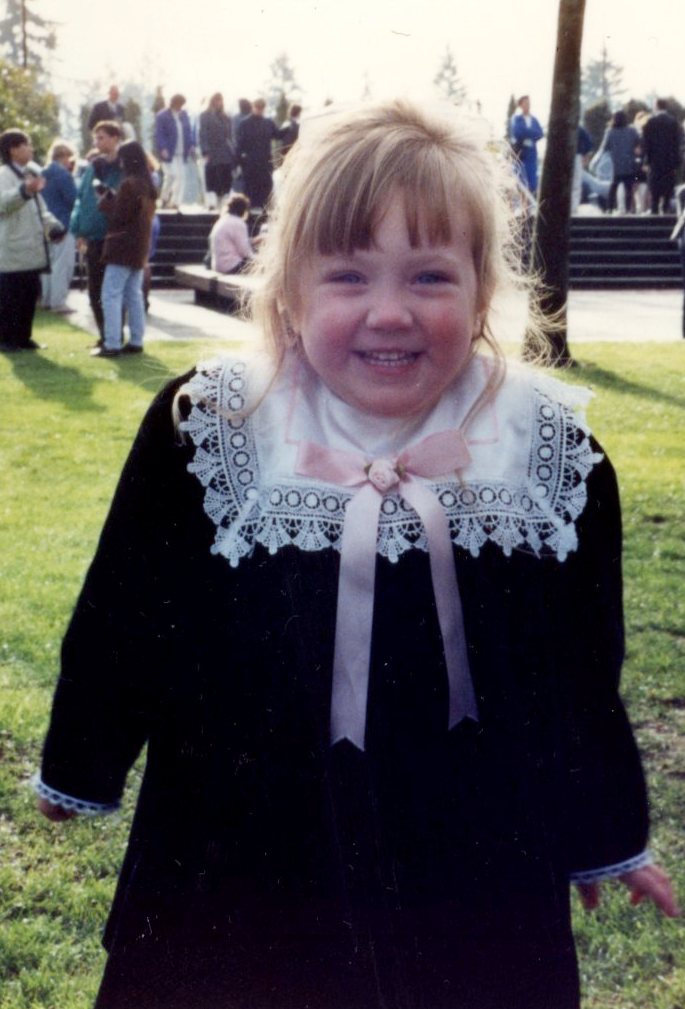 She was such a sweet little girl–this first photo was taken at an outing where six of us–Nadine and David, her parents Dennis and Judy, and Mike and I–took her to a now-defunct children’s discovery area at Point Defiance Park. All six of us trailing around after this little two-year-old…she was the complete center of attention! The second photo was when David earned his master’s degree at PLU–again the only child amidst the extended-family gathering.
