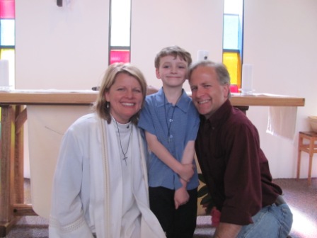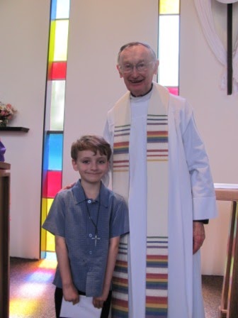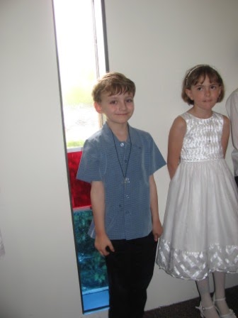 Kieran had his first communion yesterday. He made cross necklaces for all of the communicants (he spied the pattern in an Oriental Trading Company and was determined to make them). On Saturday they all gathered at the church with their teachers, the pastor, and the priest and made the communion bread.