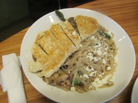 I tried out the lemon-asparagus linguini, but I was delighted to discover, when asked, that they could make it with (gluten-free) rice noodles and nix the red onion! It was delicious–with snow peas, asparagus, lemon, garlic, mushrooms, and feta cheese.
