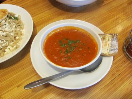 Mike and I have been eating at Noodles & Company in the Pearl District regularly, ever since Portland Center Stage moved to the Armory Building, right down the street from Noodles & Company. I adore their tomato-basil bisque–I could eat a whole gallon of it every day! We also like the vast array of choices–from Asian to Mediterranean and American (although we hardly ever choose the American menu items).