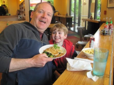 Nick loves to sit up on stools–so he wanted to eat at the “bar,” looking out the window. Mike had the Thai curry soup and the Indonesian peanut saute with chicken.