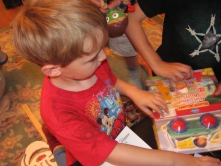 Nick is our one child who actually PLAYS with the toys he receives! Chris and Kieran would be happy to receive toys initially, but they seemed to lose interest and the toys would sit neglected. Nick gets use out of his toys…except when they have lots of little pieces. In that case, they inevitably get lost and misplaced. 😦