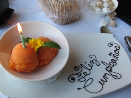 Next I made my way to the Pearl District, where my friend Judith kindly treated me to lunch at the fantastic Peruvian restaurant Andina. We shared a mixta nikkei cebiches de la casa (a mashed potato cake topped with spicy raw tuna, crab, avocado, and crispy shrimp). Then I had the Peruvian paella (ají panca-infused rice topped with a seafood medley). Look at this gorgeous sorbet they brought out for my birthday: