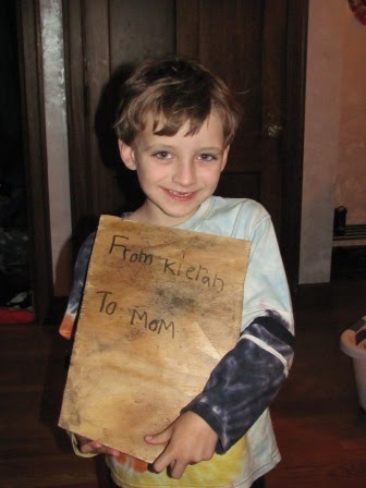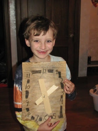 We are really pretty horrible about getting the kids to make or purchase gifts for birthdays or Christmas…it’s pure laziness and lack of training. But yesterday Kieran, completely unprompted and on his own, made me a present. A friend had given him a carpenter’s work bench…and he put it to work and made me a clock. (“The teachers all have them in their rooms,” as he informed me…) I love it!