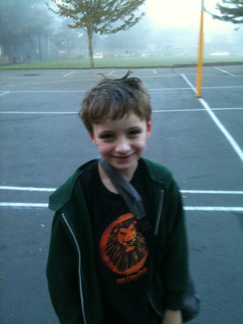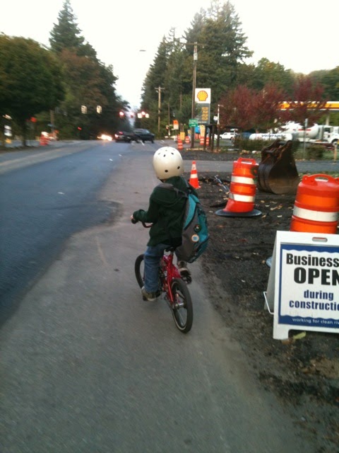 Unfortunately, I had the wrong information–so when we showed up at the first appointed meeting place (Thinker Toys in Multnomah Village), we were the only ones there. After waiting 5 minutes, we set off by ourselves. My iPhone Mapquest was useless–it did not give us an alternate route to very busy Multnomah Boulevard, which is not only under construction but also not a very pedestrian- or bike-friendly route! Racing behind a 7-year-old on a bike (and worrying about the cars whizzing by) is not a very relaxing morning walk. Fortunately we caught up with the walking school bus group of kids and chaperones, as we were nearing the school. That’s when I learned that we had shown up 10 minutes late!