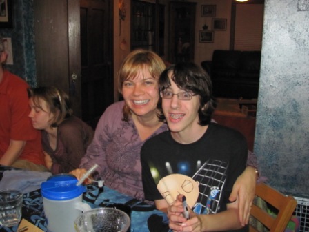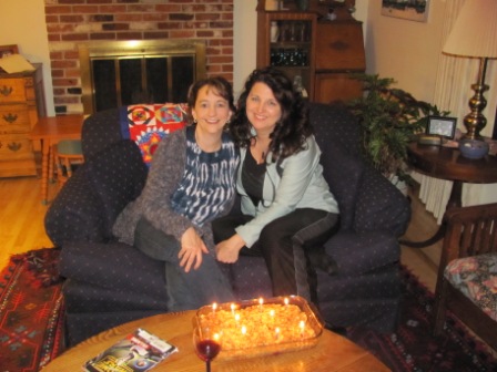 Today my sister Nadine and her family came down to celebrate our joint birthdays. Mom offered to watch her boys so we could go out to lunch. We met at Marco’s and then did a little shopping in Multnomah Village before going to my parents’ house for dinner (mulligatawny–yum!). Here we are with our birthday fruit crisp (I’ll take that over cake anytime!).