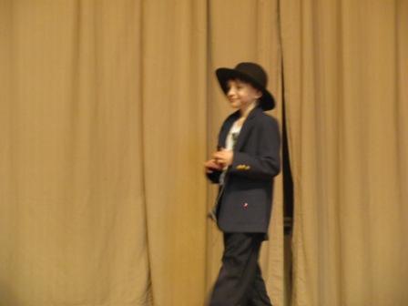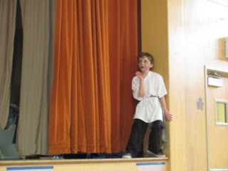 Last week Kieran was in a performance of a play written by his after-school drama club. About 12 scenes long, the plot was more than a bit confusing (it was called “The Dragon Thief”) and included all sorts of odd characters, including Kieran’s…a gangster/medicine man. (Yes, he created his own character.) Not only was Kieran in nearly every scene, but he also created programs for everyone and seemed to be behind much of the plot. The kid LOVES THE SPOTLIGHT. He’s also a little ham and likes to be physical, as you can see from the various photos: