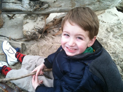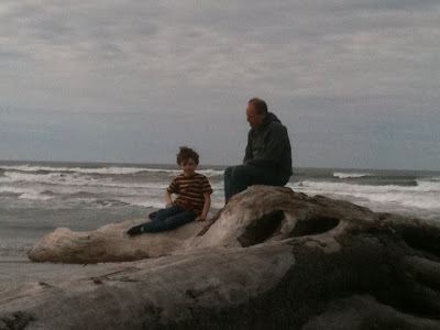 After we recovered from Mike’s big birthday festivities, on Tuesday we said goodbye to our friends who headed back to Portland. But before they left, Kristin and I took Aimee (the lone female child amid four boys!) off to Cannon Beach for a girls’ day out. I forgot to take photos…but we had a great time touring such favorite spots as the DragonFire Studio and Gallery, the Cannon Beach Book Company, Geppetto’s Toys, and other shops. It was a blessedly quiet and civilized outing! Meanwhile, Mike and Roger took the boys to the beach and to Flamingo Jim’s to buy bows and arrows and knives. (Does this sound gender biased or what??) Then Aimee got tackled by the younger boys…who were going around shirtless (or in Nick’s case, shirtless and pantless–he was “George of the Jungle”!).