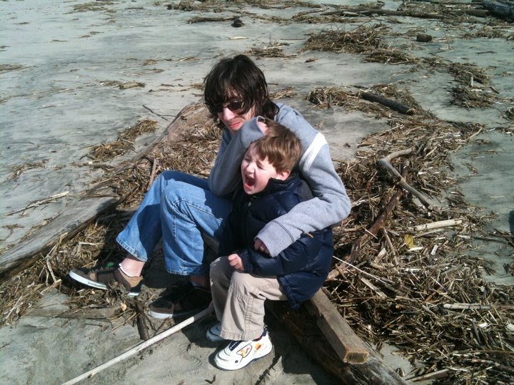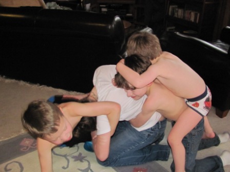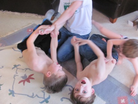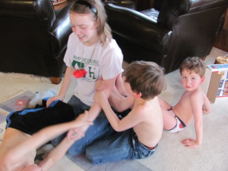 After we recovered from Mike’s big birthday festivities, on Tuesday we said goodbye to our friends who headed back to Portland. But before they left, Kristin and I took Aimee (the lone female child amid four boys!) off to Cannon Beach for a girls’ day out. I forgot to take photos…but we had a great time touring such favorite spots as the DragonFire Studio and Gallery, the Cannon Beach Book Company, Geppetto’s Toys, and other shops. It was a blessedly quiet and civilized outing! Meanwhile, Mike and Roger took the boys to the beach and to Flamingo Jim’s to buy bows and arrows and knives. (Does this sound gender biased or what??) Then Aimee got tackled by the younger boys…who were going around shirtless (or in Nick’s case, shirtless and pantless–he was “George of the Jungle”!).