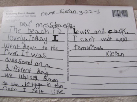 On Wednesday, we had a lazy day. Kieran wrote this sweet postcard to his teacher:
