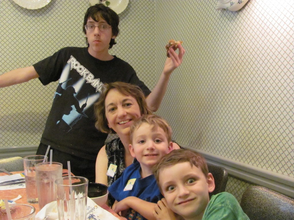 I always thought I’d have at least one daughter instead of three sons, but now I cannot imagine it any other way. I love being a mom and gazing at my boys in amazement that Mike and I created them. I love walking in the front door at the end of the work day and being jumped on by the boys, who are gleeful that I’m home. I love seeing them laugh together or hug each other. I love the way they are learning that men and boys can be sensitive, vulnerable, sweet, and respectful as well as energetic, strong, bright, and funny (I owe a great deal of gratitude to Mike for this!). I love the fact that each spring when Chris appears in a middle school musical (opening night is tomorrow), the younger boys know all of Chris’ lines and can sing all the songs. I love the way they cuddle up to me or throw their arms around me. It’s the best ego trip in the world.