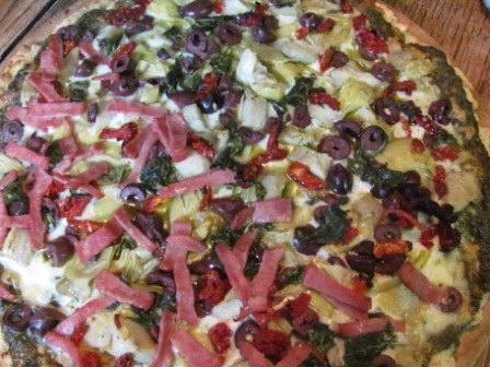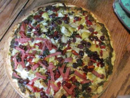 When it has prebaked, spread the pesto on top of the crust. Adorn with cheese, artichoke hears, olives, sun-dried tomatoes, and basil. (I also put slices of uncured turkey bacon [like Canadian bacon] on one half of the pizza.) Put it back in the oven for 15 minutes more. Voila! Your pizza is ready.