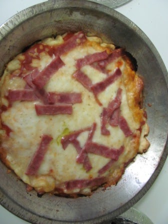 | This is Nick’s personal pizza–with tomato sauce, cheese, and bacon (we ended up taking off the bacon, and I don’t think he liked it very much judging by the fact that he had only 3/4 of a slice) |