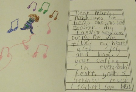 Mrs. Mabbott gave a special talk about how sad it is that we do not have music in the schools at this point and thanked me for singing with the kids. We sang a surprise song for Mrs. Schaeffer in the vein of the one we sang for our retiring principal in December. Here’s an excerpt:
