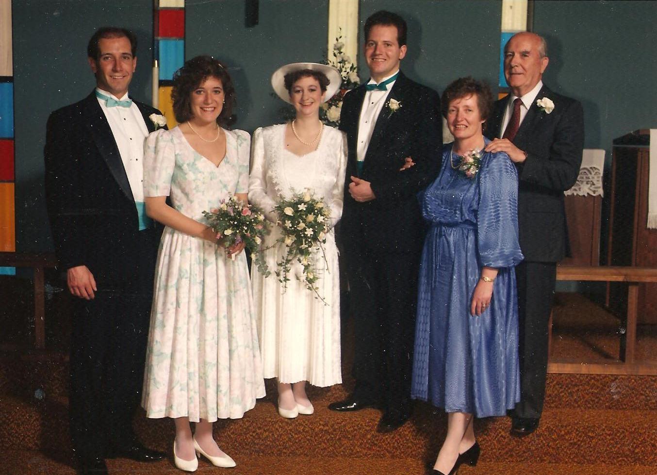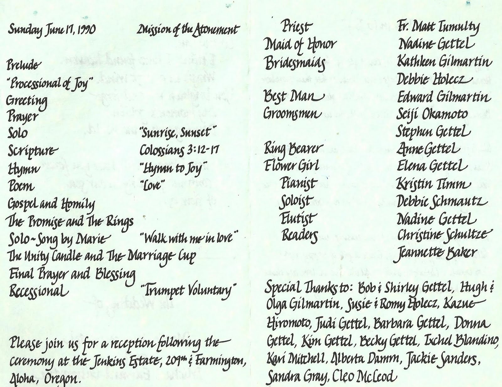 Mike’s brother, Ed, had flown in for 24 hours for the wedding…he never recovered from his jet lag, and during the reception, he’d jump up to dance frenetically for a few songs, and then collapse into a nap at a table. We had two guests from Japan at our wedding, and one of them–Seiji–was one of our groomsmen. Sadly, he became a salaryman shortly afterward and we’ve lost touch with him. He was such a hoot! In addition to Mike’s family from England, we also had his aunt and cousin and family from Ontario, Canada. It was a reasonably small, simple wedding by today’s standards, but we had great fun!