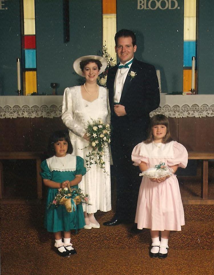 Mike’s brother, Ed, had flown in for 24 hours for the wedding…he never recovered from his jet lag, and during the reception, he’d jump up to dance frenetically for a few songs, and then collapse into a nap at a table. We had two guests from Japan at our wedding, and one of them–Seiji–was one of our groomsmen. Sadly, he became a salaryman shortly afterward and we’ve lost touch with him. He was such a hoot! In addition to Mike’s family from England, we also had his aunt and cousin and family from Ontario, Canada. It was a reasonably small, simple wedding by today’s standards, but we had great fun!