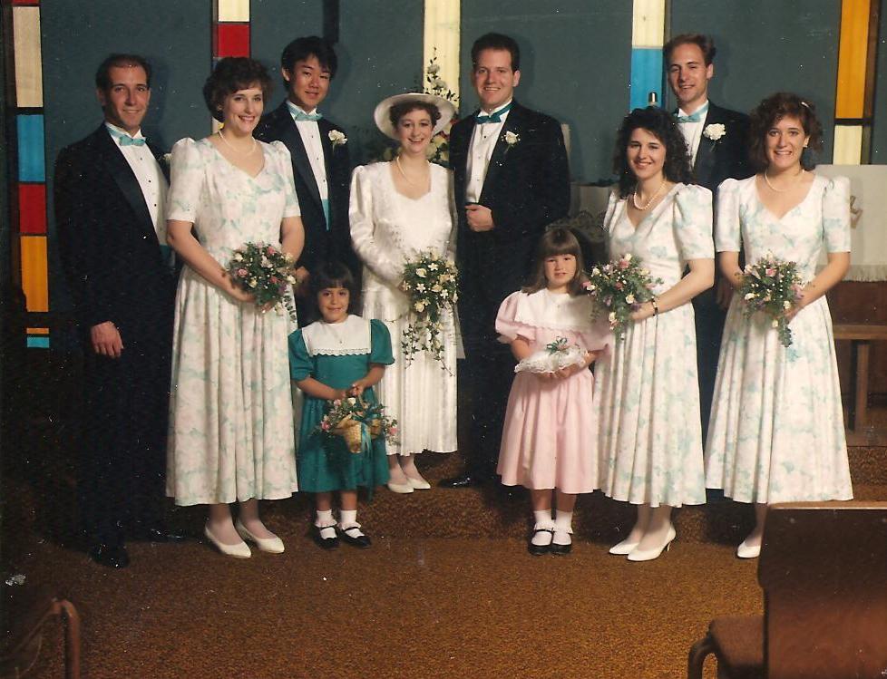 Mike’s brother, Ed, had flown in for 24 hours for the wedding…he never recovered from his jet lag, and during the reception, he’d jump up to dance frenetically for a few songs, and then collapse into a nap at a table. We had two guests from Japan at our wedding, and one of them–Seiji–was one of our groomsmen. Sadly, he became a salaryman shortly afterward and we’ve lost touch with him. He was such a hoot! In addition to Mike’s family from England, we also had his aunt and cousin and family from Ontario, Canada. It was a reasonably small, simple wedding by today’s standards, but we had great fun!