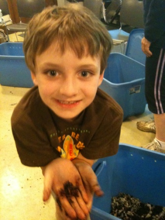 The instructor, Matthew, brought his own year-old worm bin. After helping each child create his or her own bin by creating a bed of moist, shredded newspaper and soil, he had each one choose about 25 worms. Then he added some of his rich castings and we added a top layer of moist straw.