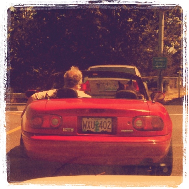 I snapped this photo at a stop light today on my way to the gym. That’s a German Shepherd there sitting in the passenger seat. I was wondering whether the dog was strapped in or is so well trained he won’t jump out of the car.