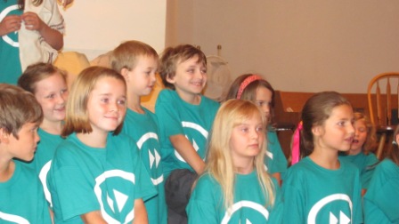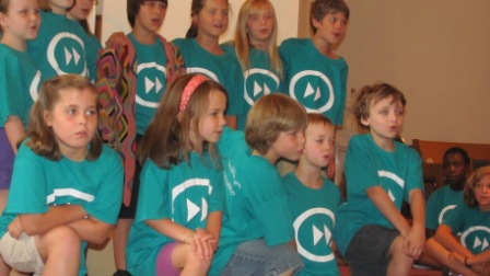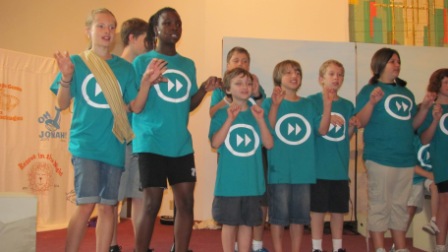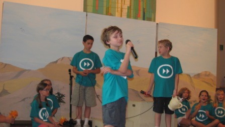 The group of kids presented “Old Testament Fast Forward,” a 45-minute play full of music and joke-filled short skits. I’m always amazed to see what a small group of highly talented and committed volunteers can do with a large group of likewise talented kids…in one week! The kids did a (nearly flawless) dress rehearsal performance Saturday morning and performed at both church services this morning.
