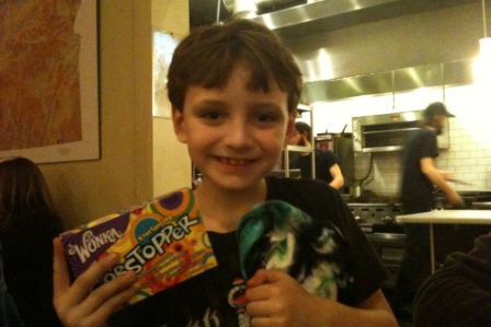 After the final show, we went to Dick’s Kitchen to celebrate. We gave Kieran a new tie-dyed shirt and a box of everlasting gobstoppers to congratulate him. His winning monologue (which landed him the part, along with his solo of “Little People”) was about everlasting gobstoppers.