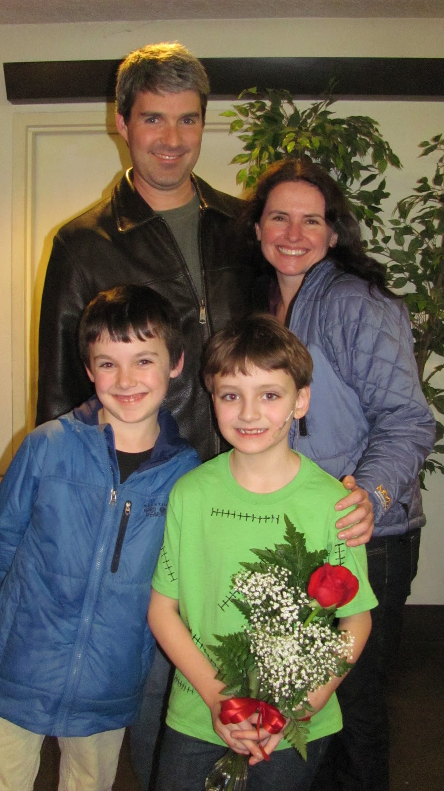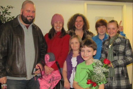 | Such a special treat! Kieran’s and Chris’ second grade teacher, Renay Schaeffer, came with her niece, and his third grade teacher, Karen Scherlie, came with her husband Sean. Didn’t get the little monster in the photo, unfortunately! |