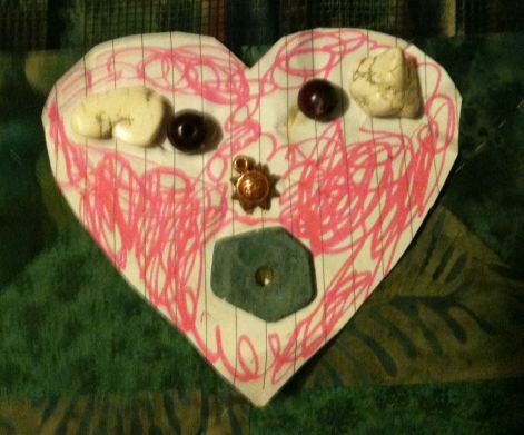 Last night I posted a photo of the Valentine’s letter Kieran left under Chris’ door. Well, I got up to use the loo at 5:00 a.m. and freaked out a bit when I saw red in the toilet bowl. I didn’t have my glasses or contacts on, so I couldn’t really investigate. Then I saw two slips of paper outside of our door–valentines for me and Mike. Cupid Kieran not only added red food coloring to the toilets and delivered valentines, but he also sprinkled cut-out hearts on the stairs and around the house, and left a “craft” on the table.