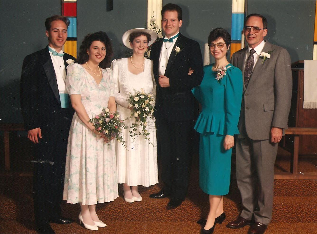 All of our siblings were in the wedding party. At the time, I hardly knew Mike’s siblings at all, but I’m glad they were part of our wedding. The only person missing was our wonderful sister-in-law Shemara, whom we didn’t meet until many years later. Family is forever, and friendships can change. Sadly, Mike’s dad died only a couple of years later, and I’m so glad we have his wonderful Scottish brogue captured on the wedding video.