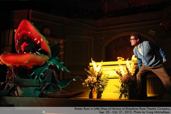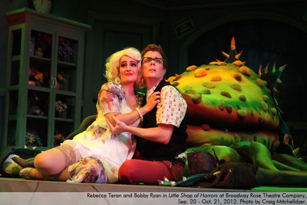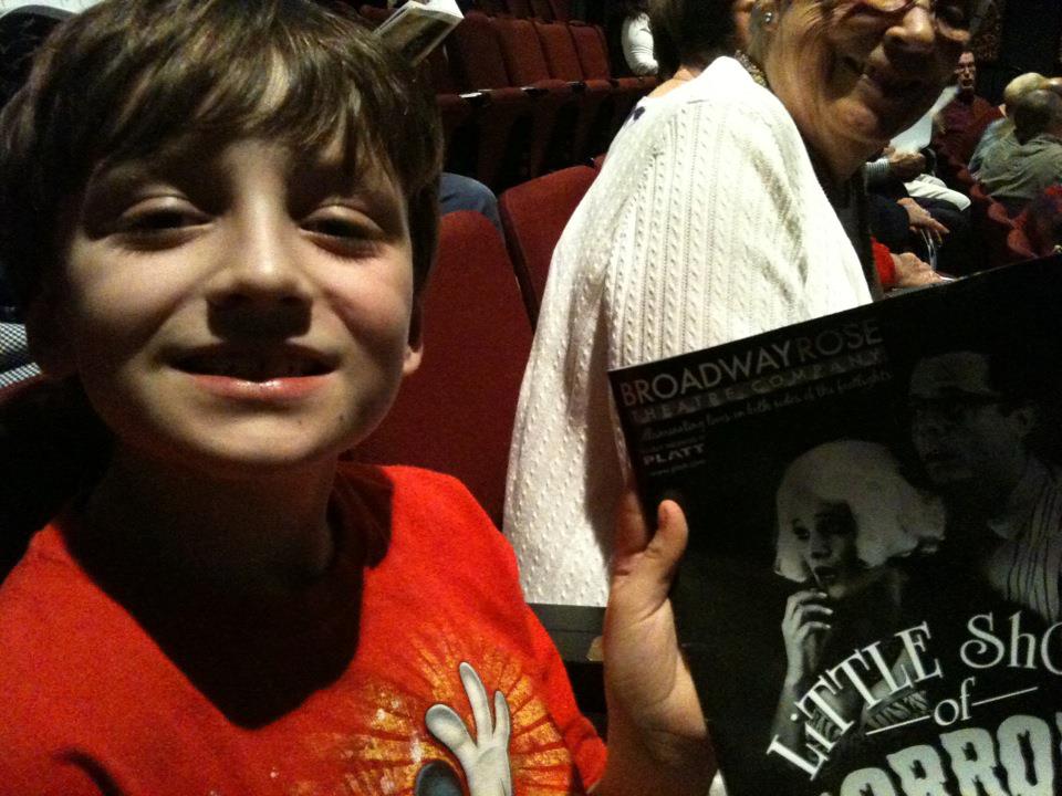 Last night I took Kieran out to see “Little Shop of Horrors” at the Broadway Rose Theater. For his birthday in April, we gave him a coupon book with coupons for a trip to the Dollar Tree, a trip to the candy shop, a Starbucks date, a movie night, $20 anytime, quality time with Mom and Dad (separately), and a night out at the theater. He decided to cash in the theater coupon for this show. I was delighted to accompany him! We’ve attended a number of kids’ and teen shows at Broadway Rose, but this was our first “real,” professional show.