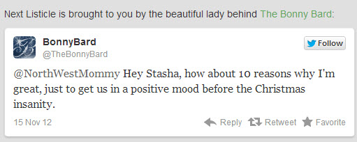 Listicles is brought to us by Stasha at www.northwestmommy.com. Check out her blog and the links to the others!
