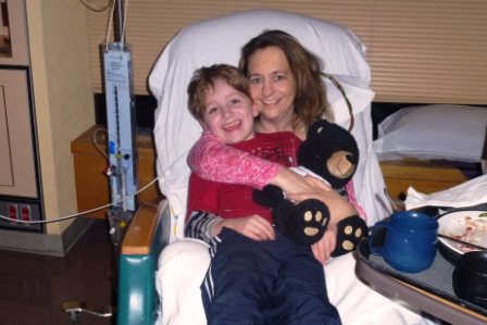 Before the surgery, I had received an ICU brochure that said that no children under 12 were allowed to visit. I told the pre-surg nurse that this would be difficult for me because I had two children under 12. (At that time I thought I would be in the ICU only one night, remember.) The first couple of days after surgery were tough, and I wasn’t ready to have visitors (especially those of small stature and loud voice). But then on Friday, Adam Lanza burst into a Connecticut school and killed 20 children and 6 adults. This happened just a few days after the shooting rampage in a mall only 1/2 hour from our house (the day before my surgery). As friends were posting on Facebook that they wanted to go get their kids from school and hug them tight, I felt desperate to see my kids. I asked my nurse if they ever made any exceptions, and she told me that the under-12 policy was abolished. Now it’s up to the patient’s nurse to decide. She said that of course, my kids could come see me, and that they have not really adequately updated policies or staff with the new, more family-friendly rules. So Friday evening, the day that the nation mourned, I got to hug my kids (after Mike brought them into the unit past a frowning secretary who clearly had not received the memo!). Priceless.