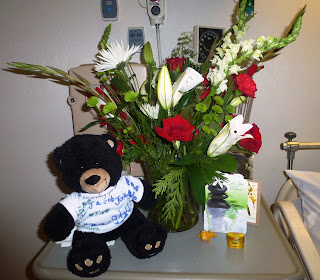 Receiving beautiful Christmas flowers and a Build-a-Bear signed by Nicholas’ kindergarten class…hugging my kids…being able to wear my own pajamas (I had two beautiful pairs for the hospital, one from Nadine and one from my friends Catherine and Kristin)…walking around the unit and stretching my legs…having my IVs removed…being able to wear contact lenses (my glasses got stretched out from being worn over my bandages the first few days)…getting my spinal drain removed and being able to move about independently…eating healthy food (the hospital had very healthy food, although I was tired of the menu selections by the time I left)…receiving e-mails and Facebook messages from so many people, telling me they are praying and thinking positive thoughts for me.