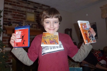 Kieran had a theatrical Christmas–he received books of scripts, several DVDs (Oliver, West Side Story, PBS series on Broadway), and three Wii dance and karaoke games…in addition to a lap harp (like a zither).
