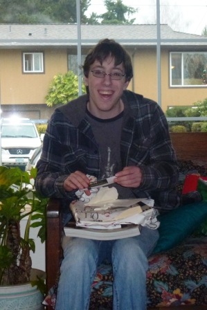 Chris had a musical Christmas–he received a cowbell for his drum set, a large stack of books about various bands (Springsteen, Red Hot Chili Peppers, Coldplay, U2, The Killers, and a DJ book), nice headphones, and a ticket to see “The Book of Mormon” with us.