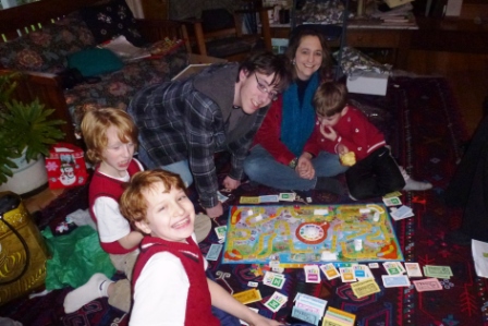 Trying out the new “Life” game we gave our nephews (after we spent 1/2 hour putting it together!) |