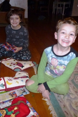 | Kieran and Nicholas ready to open up stockings and Santa gifts |
