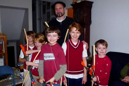 My brother made handcrafted bows and arrows for the five young boys…the bows are made out of bamboo, and the arrows have Nerf tips on the end to keep them safe. Such a COOL uncle!!! The boys all loved them, of course!!! And I think about how our parenting views have changed…when we were new parents, we never would have imagined we’d allow our boys to have bows and arrows…or swords…or anything like that. We still draw the lines at guns. Somehow bows and arrows and swords seem a little less violent. Ha!