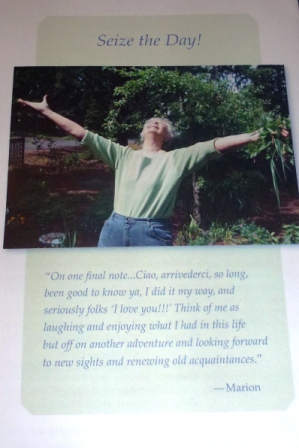 Marion planned her own memorial service many years ago, and it showed. The songs and readings were upbeat and inspiring, especially the final one, “City of God.” As we were walking out, they played “Oh Happy Day” by Ladysmith Black Mambazo. And most inspiring of all was this photo (to the right) on the back of the program and in front of the church, accompanied by these words: