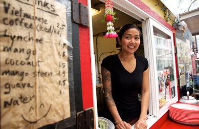 Continuing on my food cart adventures, yesterday I visited Nong’s Khao Man Gai for the first time. This is the second cart owned by Nong Poonsukwattana, who arrived in Portland in 2003 and began working at local Thai restaurants such as Pok Pok. She has wisely focused her food cart on one dish: khao man gai, chicken and rice, a favorite street food and comfort dish in Thailand. It’s simple: poached Draper Valley organic chicken simmered in chicken stock and Thai herbs, served with rice, cucumbers, cilantro, and a delicious sauce made of fermented soybeans, ginger, garlic, Thai chilies, vinegar, housemade syrup, and soy sauce, and accompanied by a light soup.