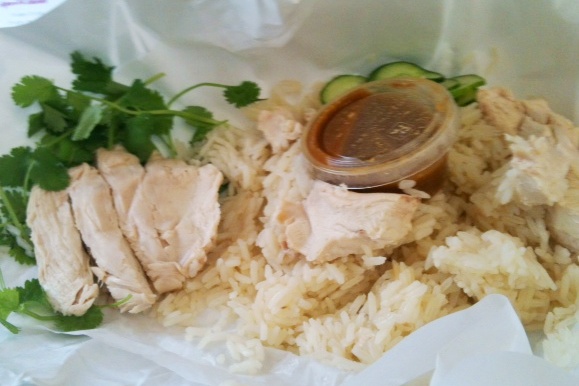 Gourmet Magazine named Nong’s food cart as #2 in “Eight Great Street Food Vendors in Portland, Oregon,” and Nong has been recognized locally and even internationally for her talent and the flavor of her food. And until I stopped by her cart yesterday, I had no idea! The dish is offered with peanut sauce (which I love), so I asked the woman in the cart if she would recommend that or the original, and she told me I should try the basic chicken and rice, which comes with its own tasty, unique sauce.
