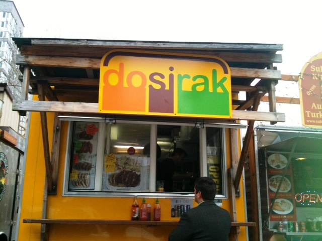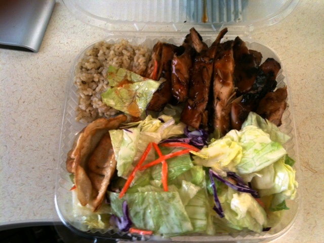 So it was back to my beloved Dosirak–they are the next cart in the line. They have a simple menu–serving teriyaki charbroiled chicken on a bed of rice (they are one of the few carts to offer brown rice!), with “mandoo” (Korean term for dumplings, or as they say in Japan and our family, gyoza) and salad with a delicious miso dressing. Not only is the food delicious, but it’s also enough for two days–for $7, that’s a great deal! Some might find the teriyaki sauce to be a bit sweet, but I like it.
