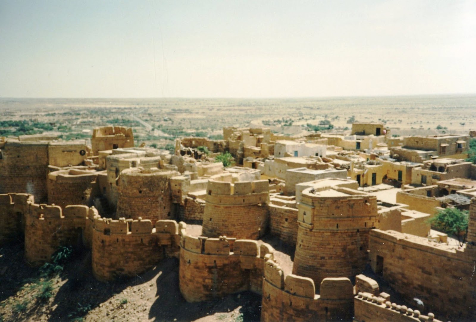 We reached Jaisalmer, nicknamed “the golden city,” around 8:15 a.m., along with many other foreigners. The beautiful walled city of Jaisalmer is known for its camels. We stayed in a converted caravanserai, called Sri Narayan Vilas, which was of average quality. According to the hotel Web site, now all the rooms there are air conditioned. Not back in 1989! The windows did not have screens, and Jaisalmer had a lot of insects. We found the hotel service to be overly attentive, to the annoying stage, and they pushed the camel safaris hard. We insisted that we wanted to relax for awhile. Did we want to go on a jeep tour this afternoon? No thank you, we said. After resting for most of the day, the electricity went out at around 5:00, so we went out for a walk.